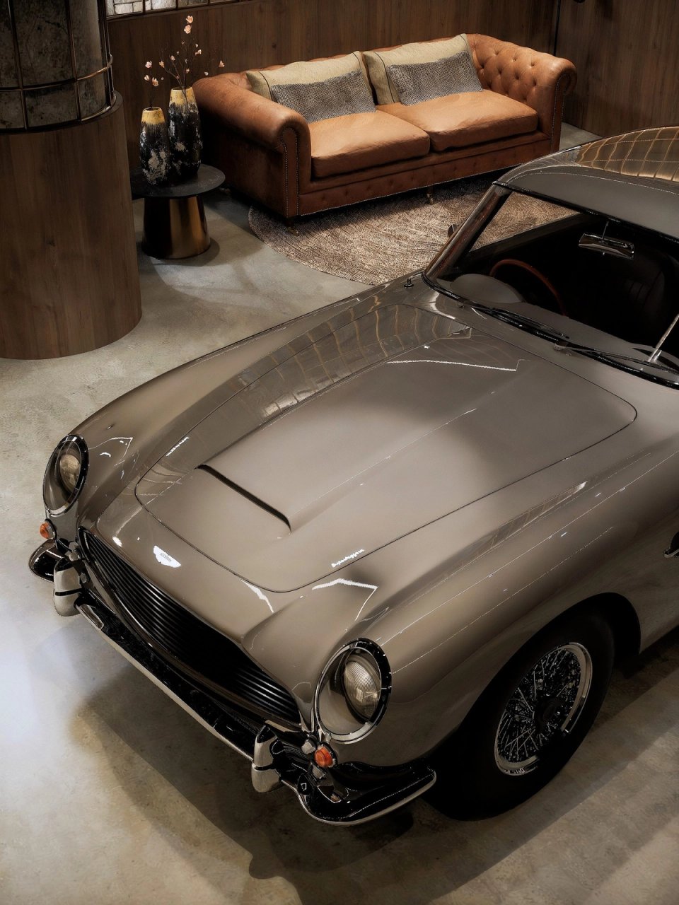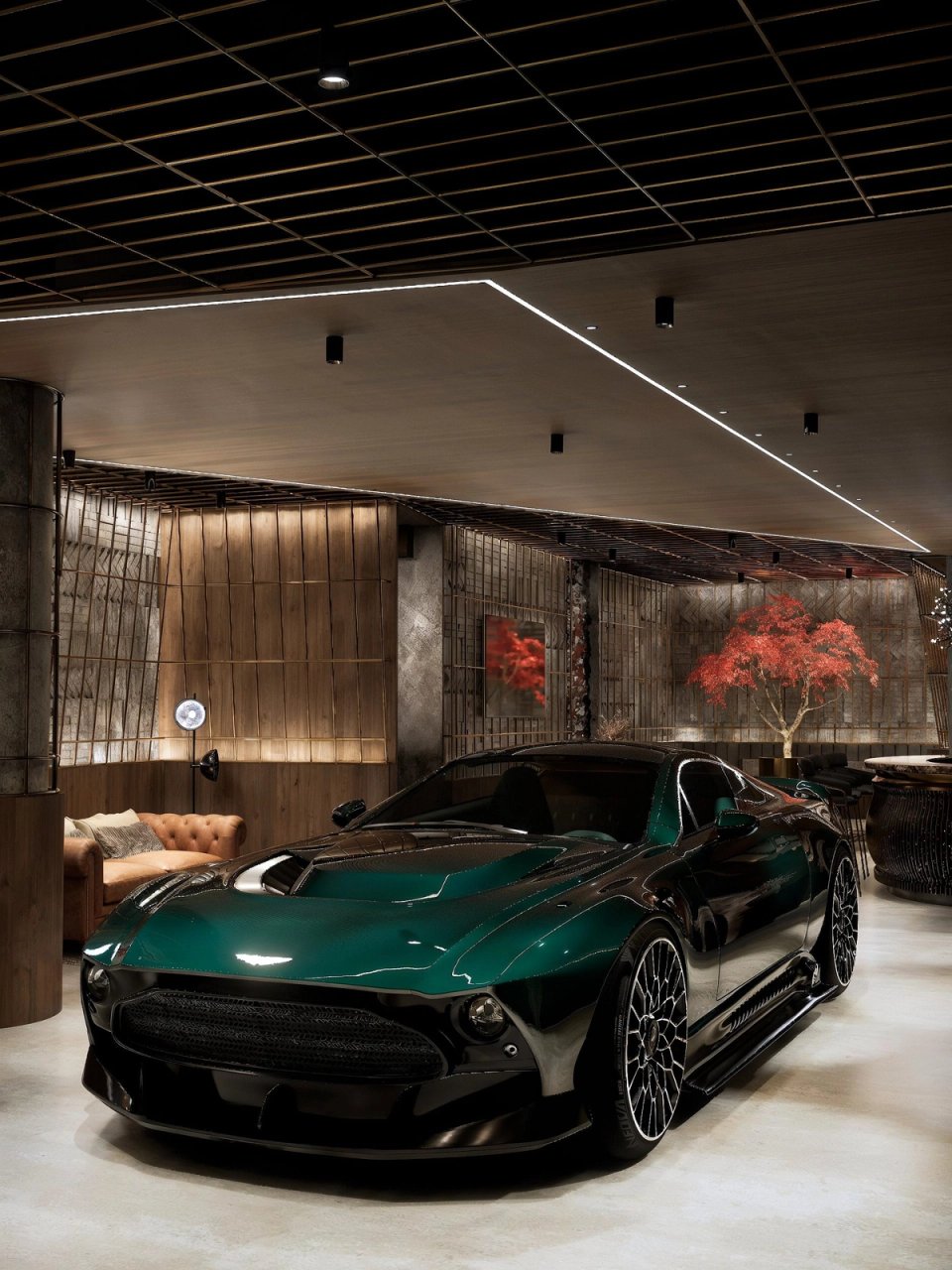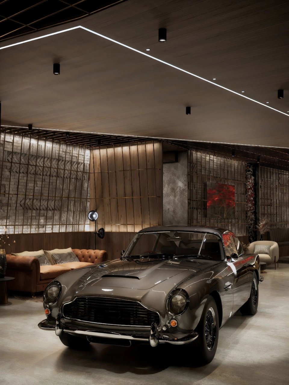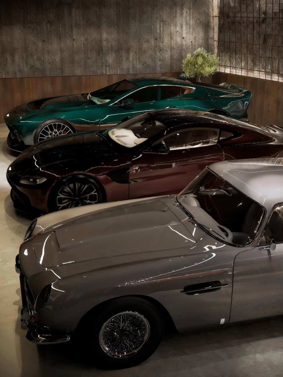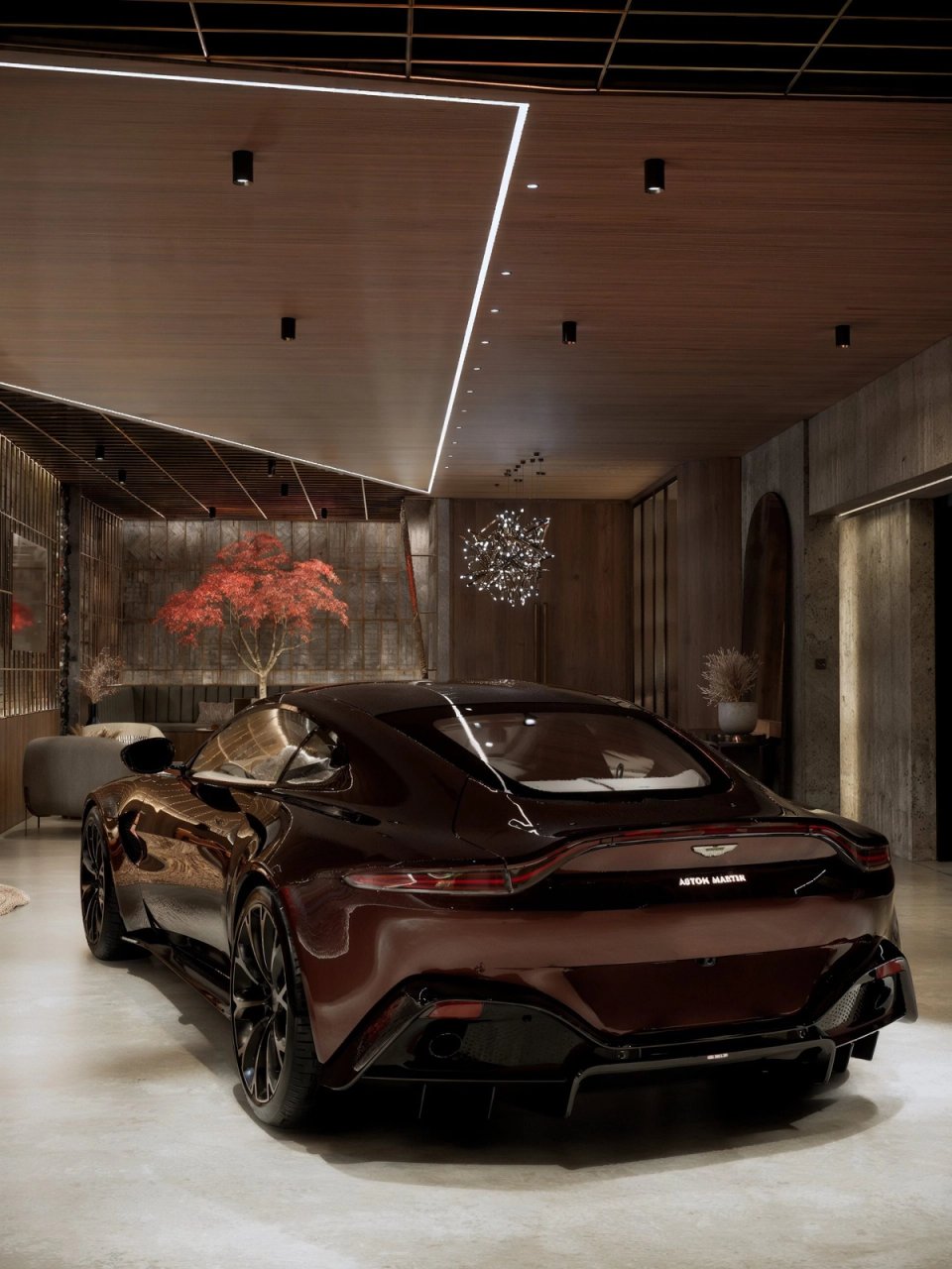 Aston Villa rassemble trois véhicules Aston Martin iconiques : la Victor en vert, la DB5 en gris et la Vantage 2025 en bordeaux. L'espace associe béton brut, grilles en laiton satiné et éclairage sculptural dans une mise en scène pensée comme une œuvre d'art. Un salon s'organise autour d'un érable japonais flamboyant, avec fauteuils enveloppants et mobilier sur mesure. Un bar en marbre courbé aux lignes organiques complète l'expérience. Aston Villa incarne l'essence du garage Signature : émotion, maîtrise et culture automobile.