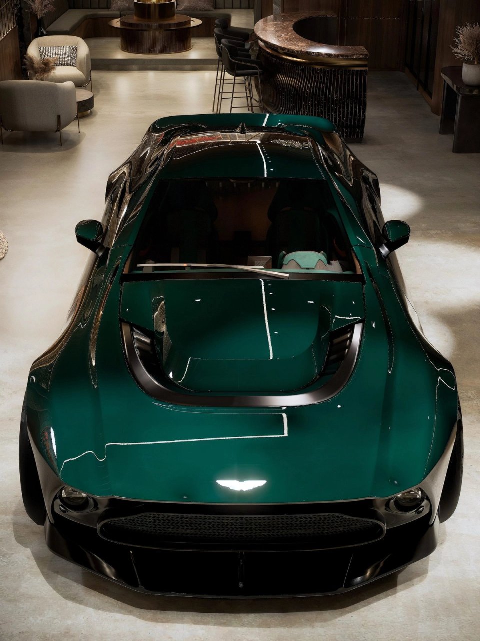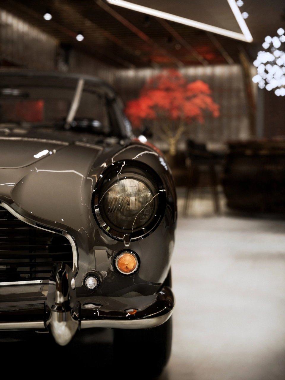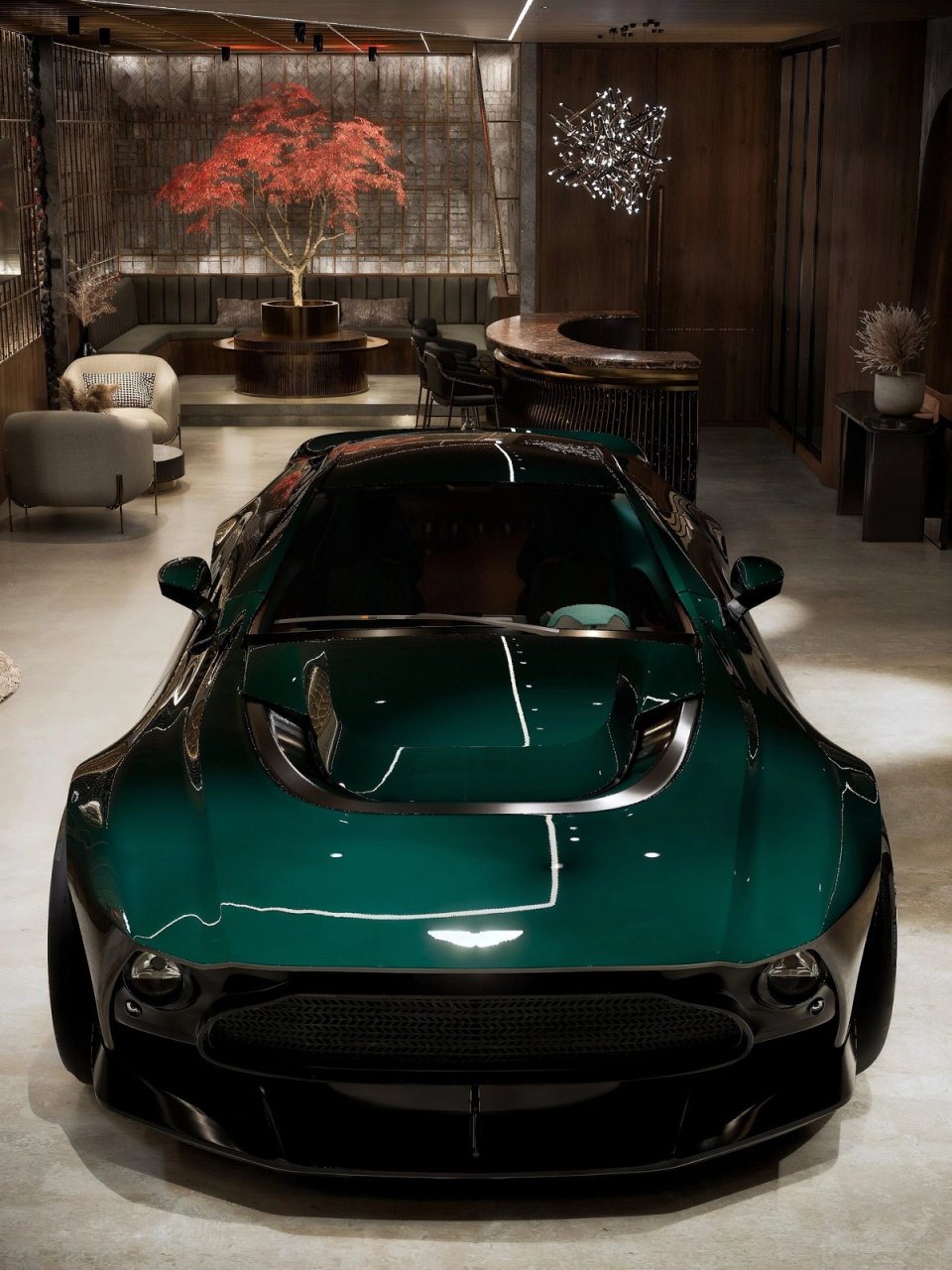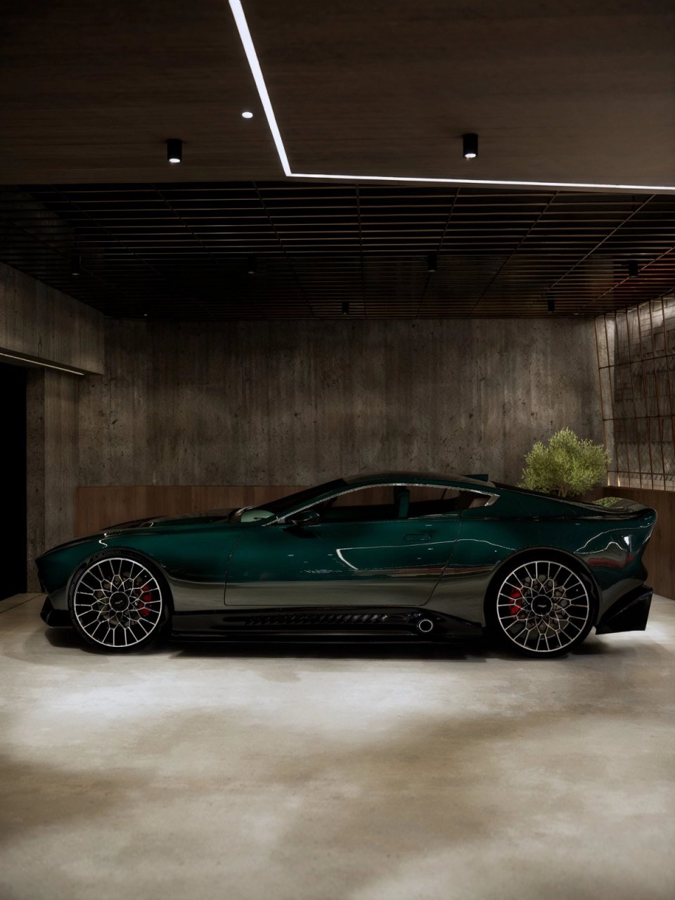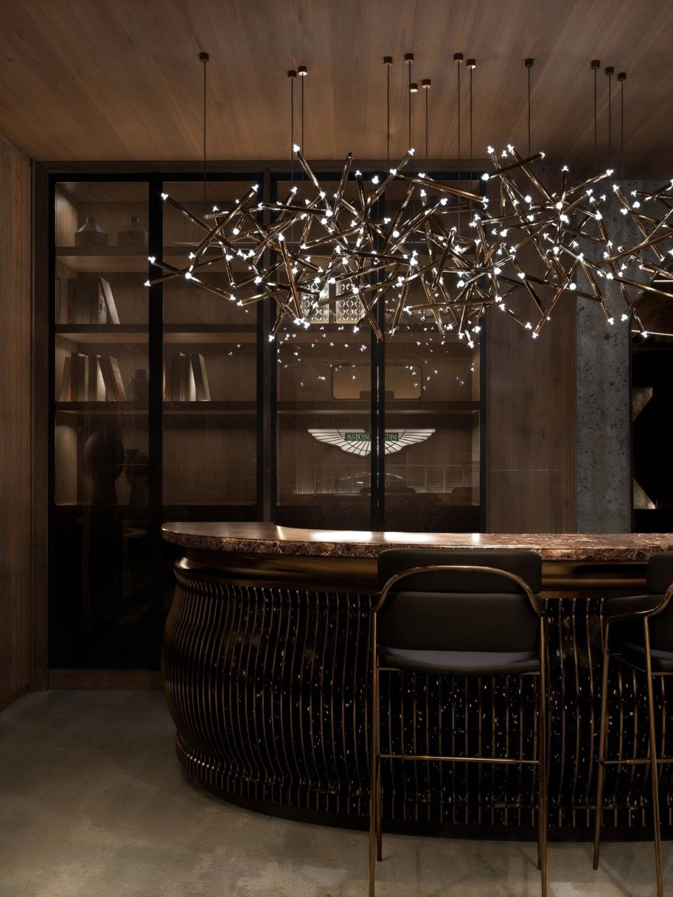 Aston Villa rassemble trois véhicules Aston Martin iconiques : la Victor en vert, la DB5 en gris et la Vantage 2025 en bordeaux. L'espace associe béton brut, grilles en laiton satiné et éclairage sculptural dans une mise en scène pensée comme une œuvre d'art. Un salon s'organise autour d'un érable japonais flamboyant, avec fauteuils enveloppants et mobilier sur mesure. Un bar en marbre courbé aux lignes organiques complète l'expérience. Aston Villa incarne l'essence du garage Signature : émotion, maîtrise et culture automobile.