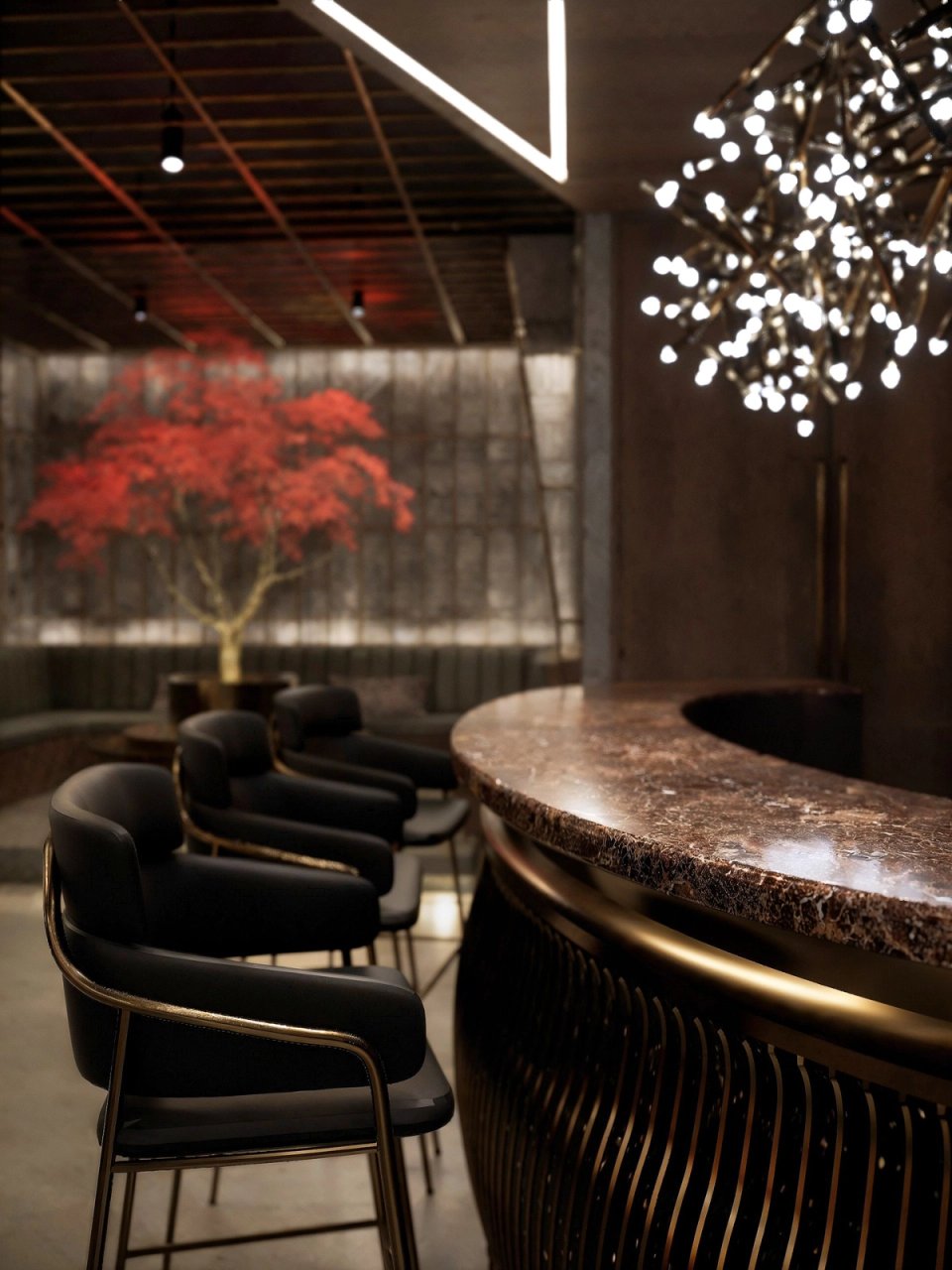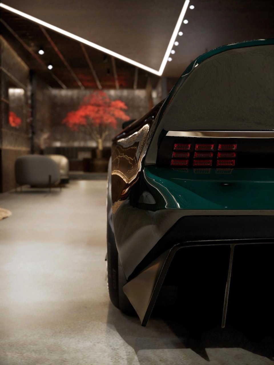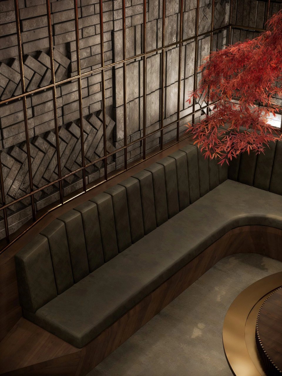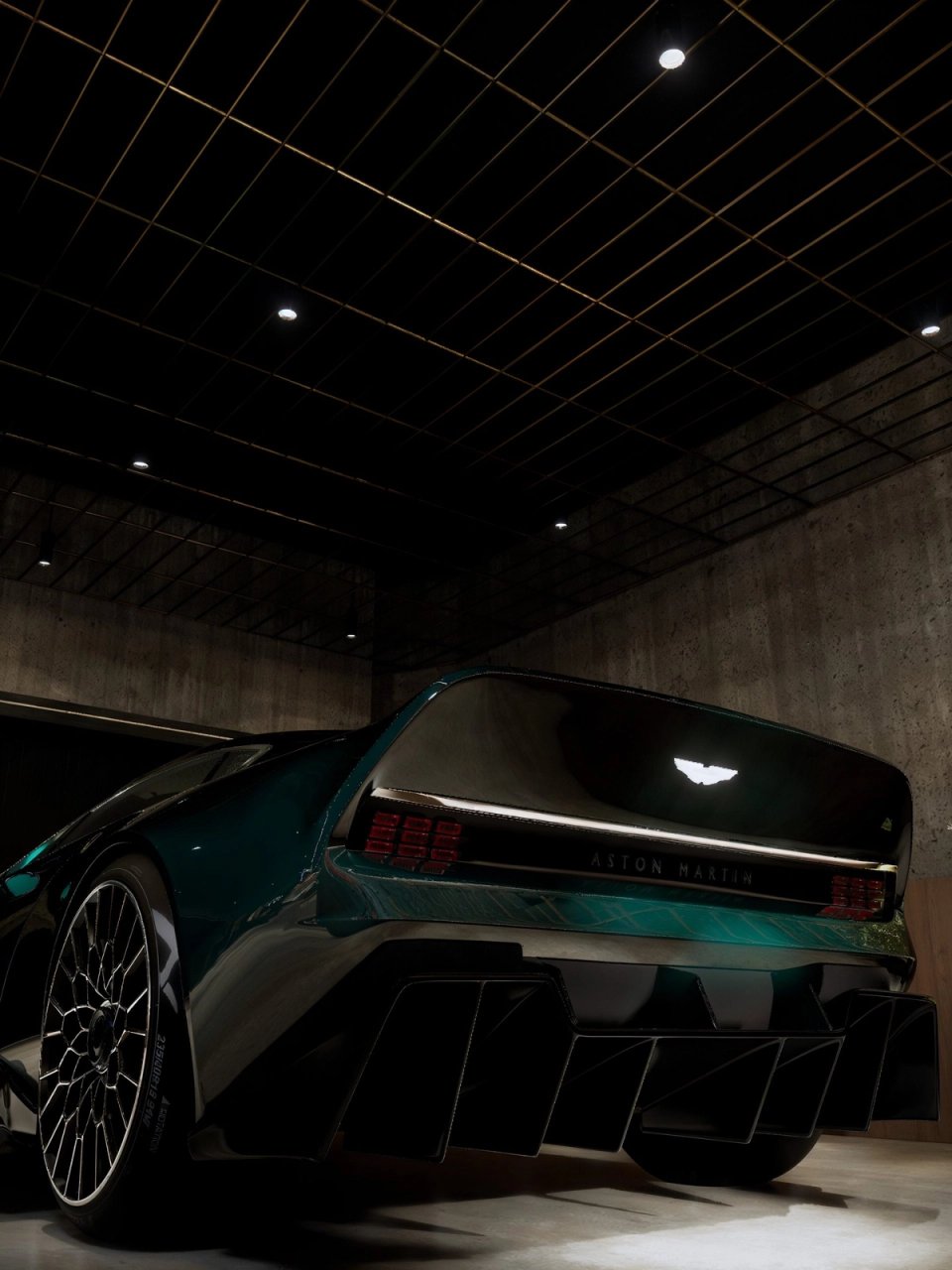 Aston Villa rassemble trois véhicules Aston Martin iconiques : la Victor en vert, la DB5 en gris et la Vantage 2025 en bordeaux. L'espace associe béton brut, grilles en laiton satiné et éclairage sculptural dans une mise en scène pensée comme une œuvre d'art. Un salon s'organise autour d'un érable japonais flamboyant, avec fauteuils enveloppants et mobilier sur mesure. Un bar en marbre courbé aux lignes organiques complète l'expérience. Aston Villa incarne l'essence du garage Signature : émotion, maîtrise et culture automobile.