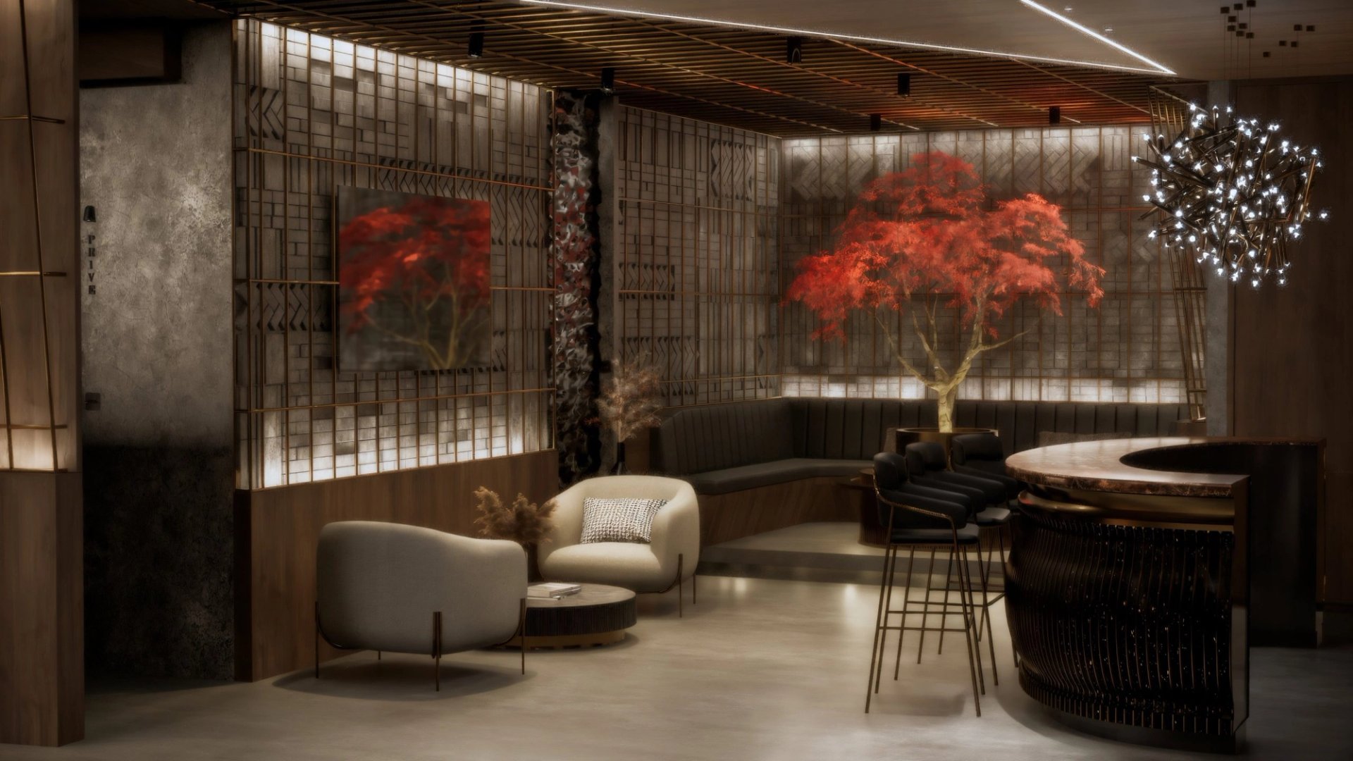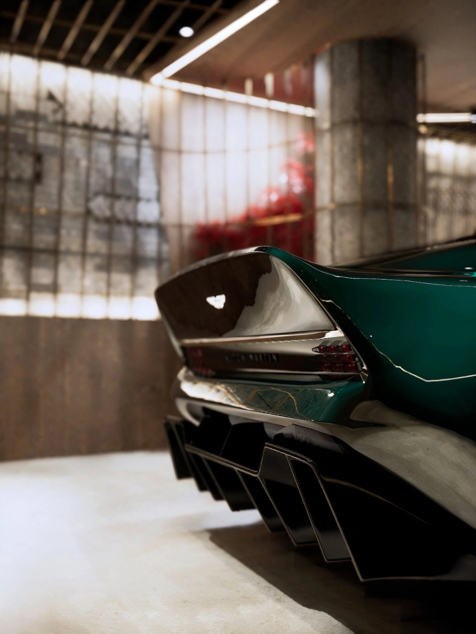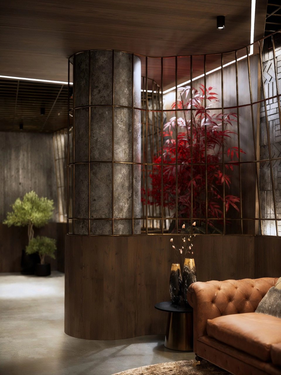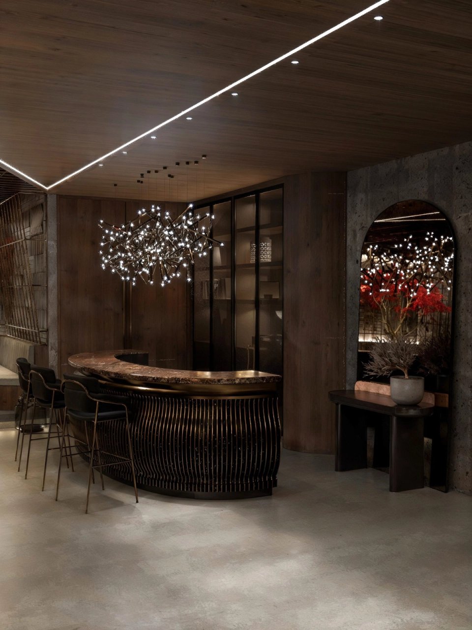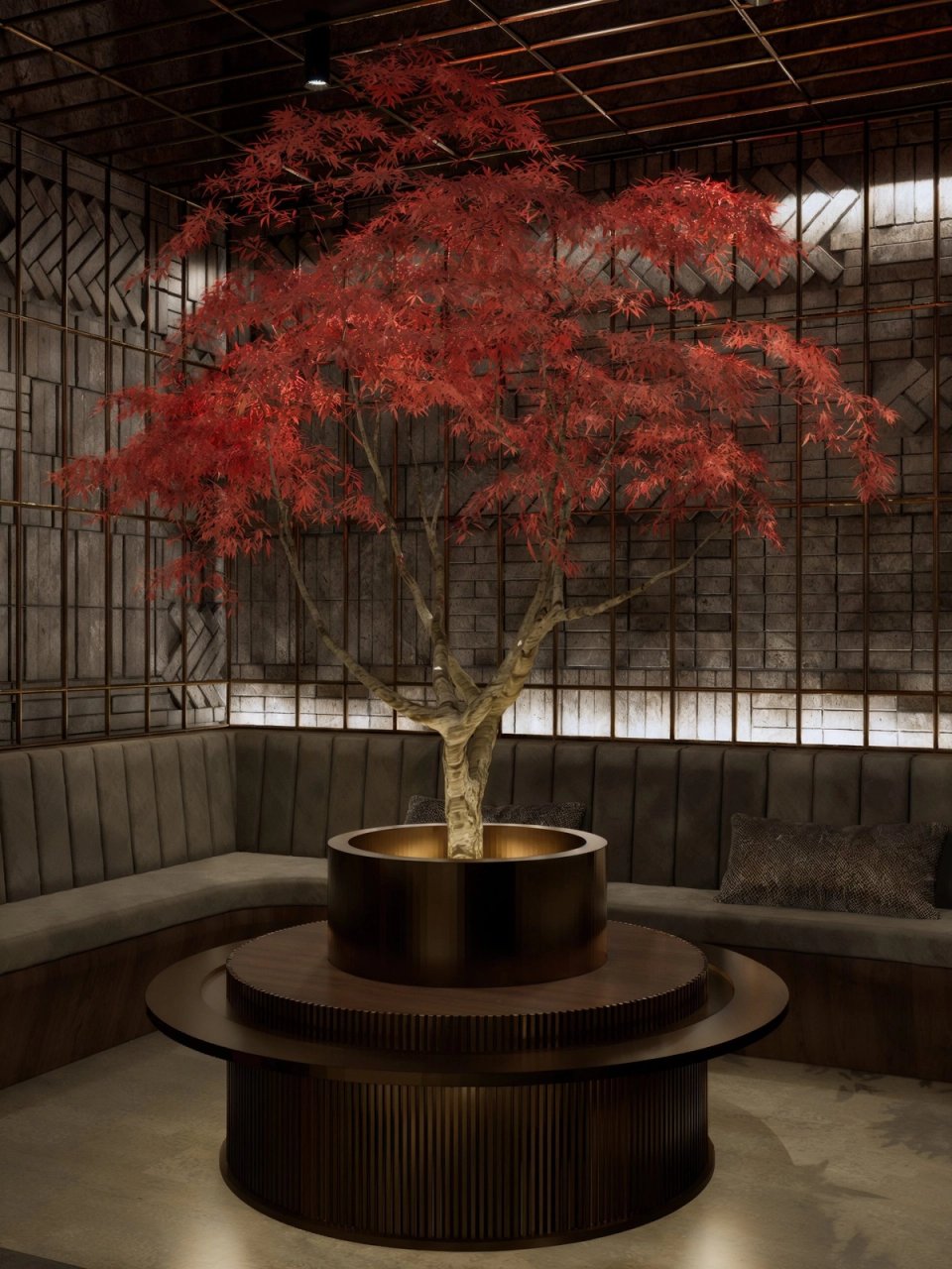 Aston Villa rassemble trois véhicules Aston Martin iconiques : la Victor en vert, la DB5 en gris et la Vantage 2025 en bordeaux. L'espace associe béton brut, grilles en laiton satiné et éclairage sculptural dans une mise en scène pensée comme une œuvre d'art. Un salon s'organise autour d'un érable japonais flamboyant, avec fauteuils enveloppants et mobilier sur mesure. Un bar en marbre courbé aux lignes organiques complète l'expérience. Aston Villa incarne l'essence du garage Signature : émotion, maîtrise et culture automobile.