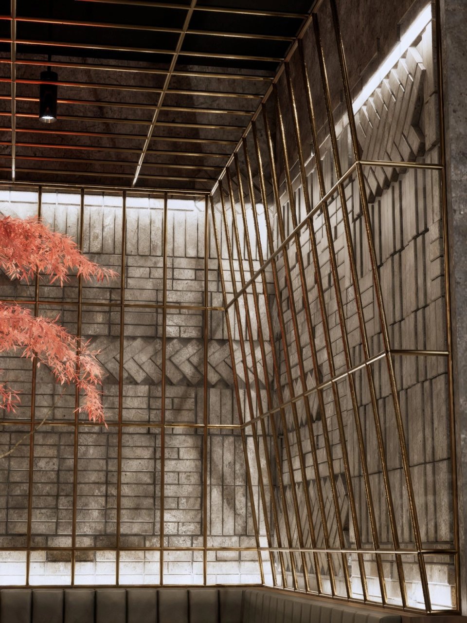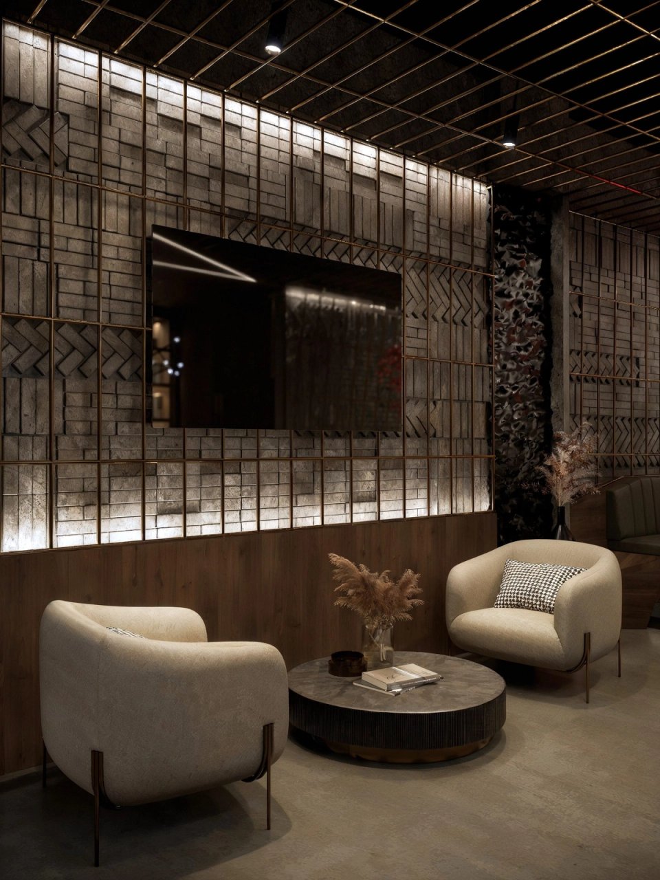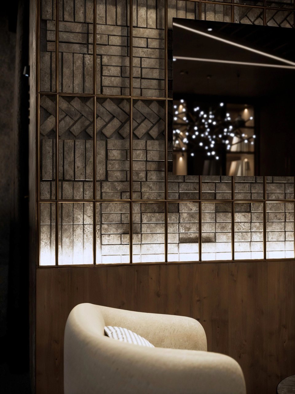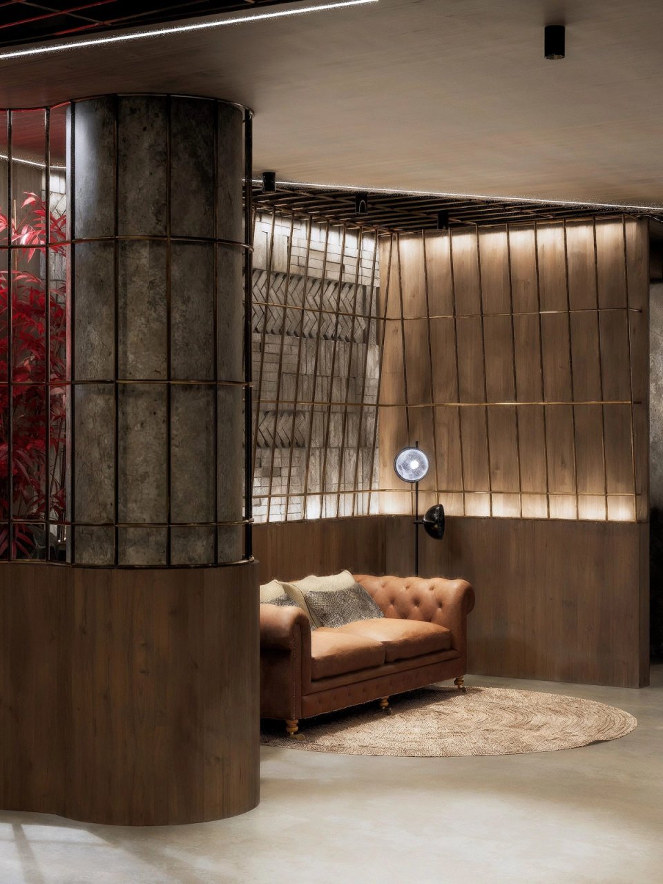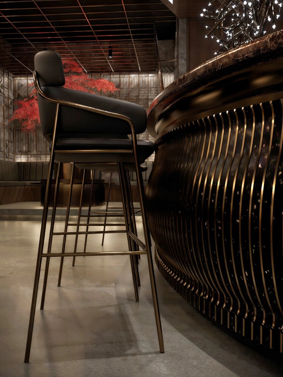 Aston Villa rassemble trois véhicules Aston Martin iconiques : la Victor en vert, la DB5 en gris et la Vantage 2025 en bordeaux. L'espace associe béton brut, grilles en laiton satiné et éclairage sculptural dans une mise en scène pensée comme une œuvre d'art. Un salon s'organise autour d'un érable japonais flamboyant, avec fauteuils enveloppants et mobilier sur mesure. Un bar en marbre courbé aux lignes organiques complète l'expérience. Aston Villa incarne l'essence du garage Signature : émotion, maîtrise et culture automobile.
