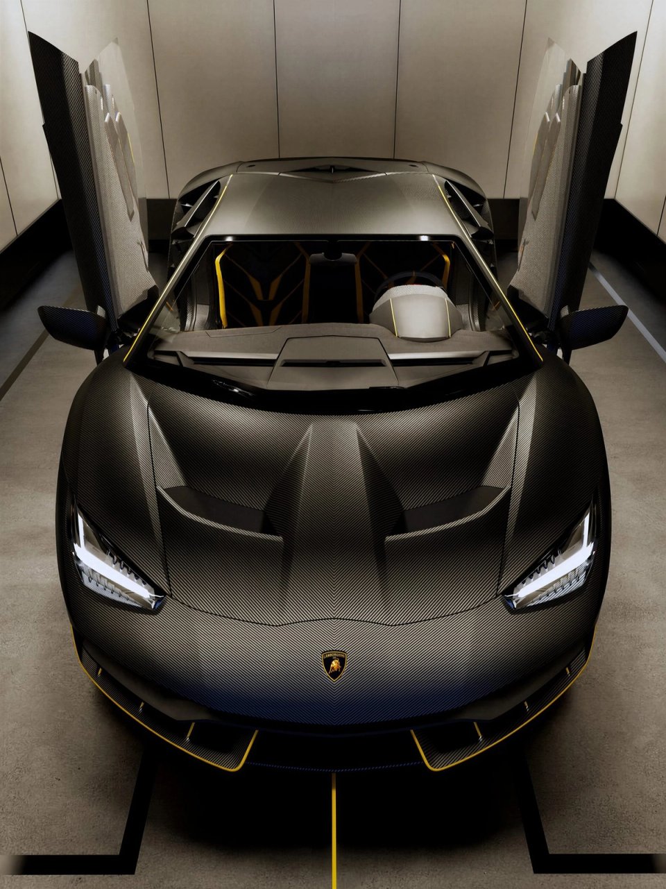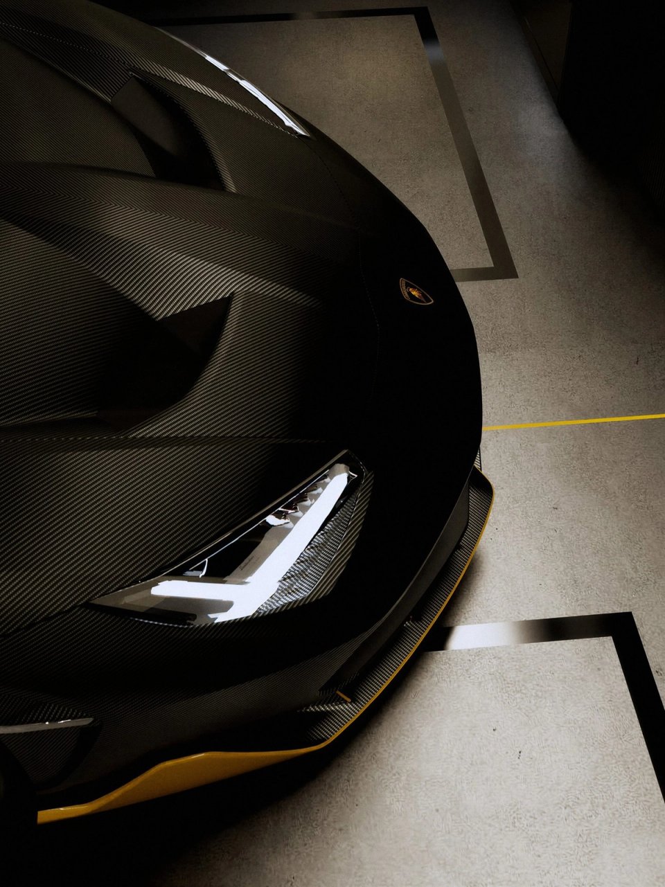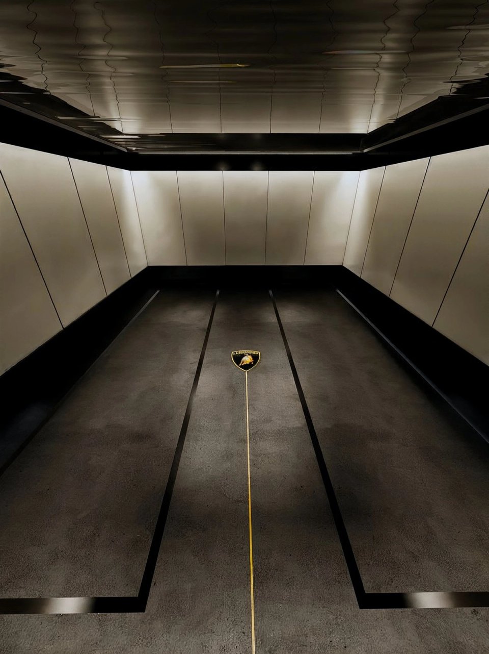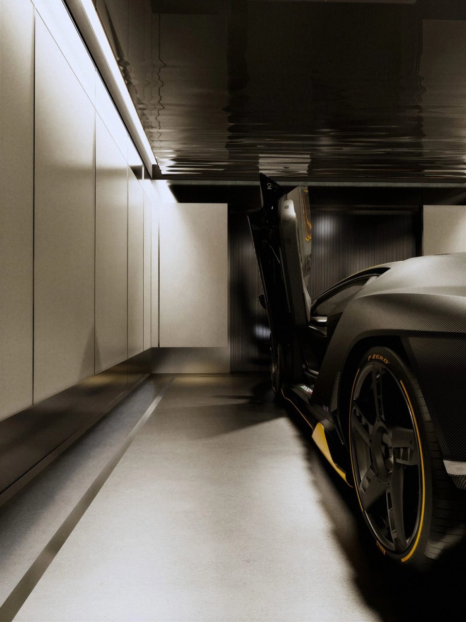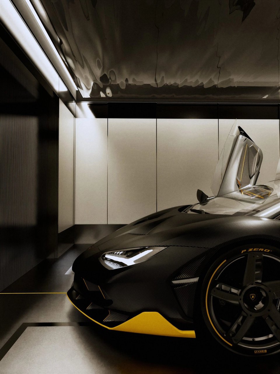 Créée pour le centenaire de Ferruccio Lamborghini, la Centenario a été produite en seulement 40 exemplaires. En Suisse, sur 34 m², Car|Hedonist a conçu un box qui tient de la galerie privée. Le contraste entre l'enveloppe claire et le socle sombre met en valeur les volumes agressifs de la carrosserie carbone. Le plafond réfléchissant amplifie la lumière, tandis que des lignes au sol et un trait doré central transforment chaque entrée en séquence chorégraphiée. L'éclairage, traité comme en scénographie, fait de ce box un lieu de contemplation et de plaisir de possession.