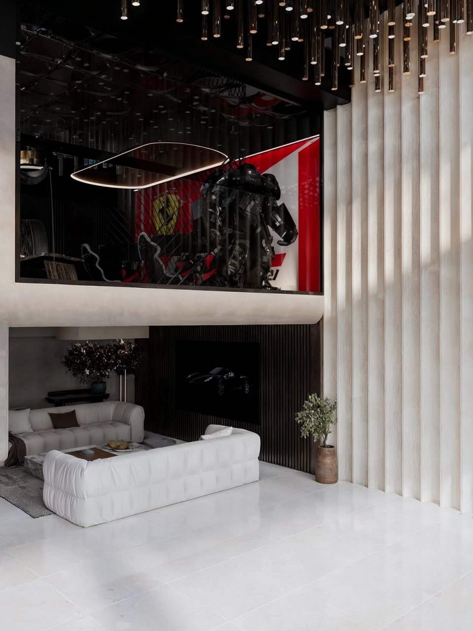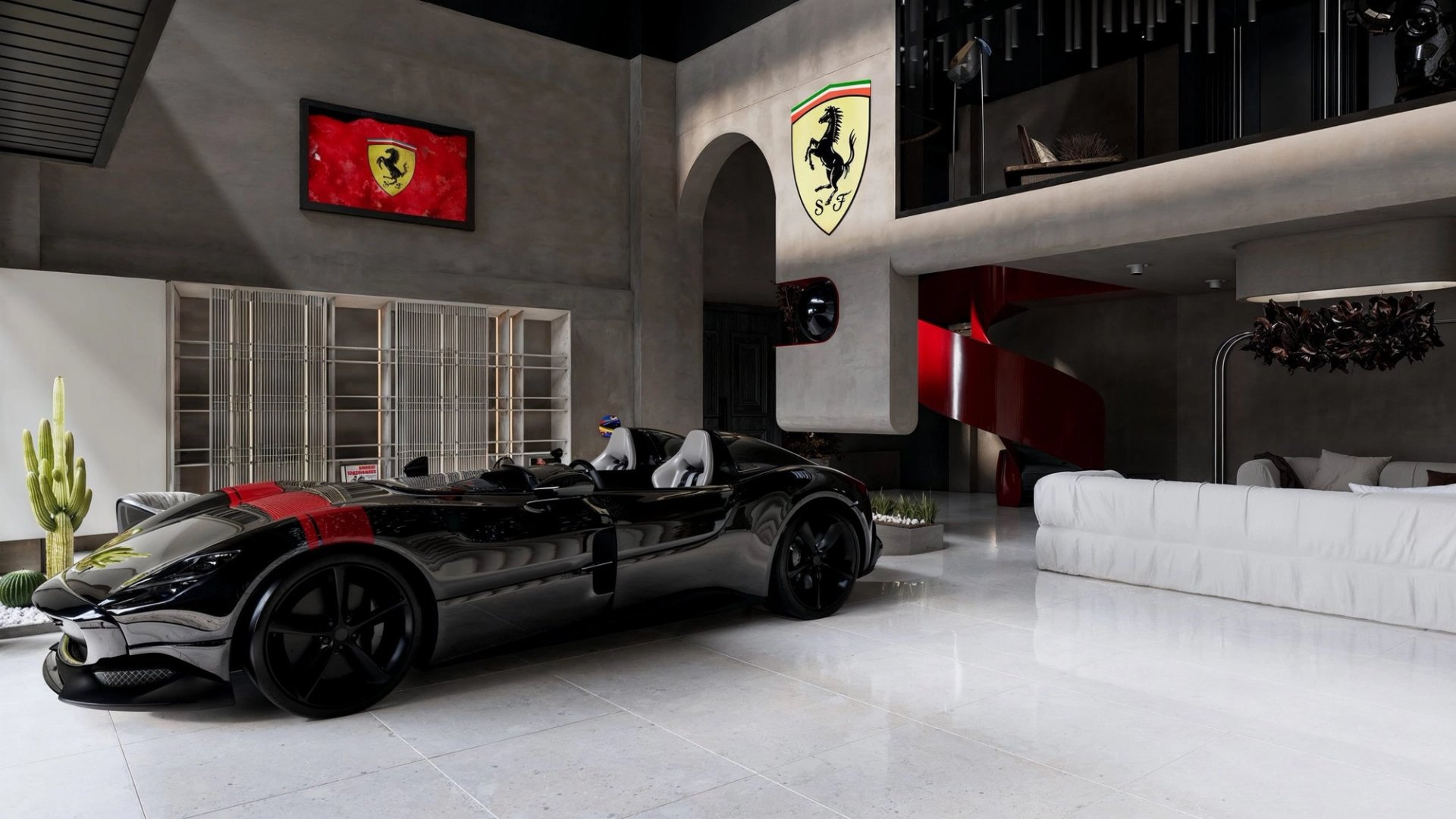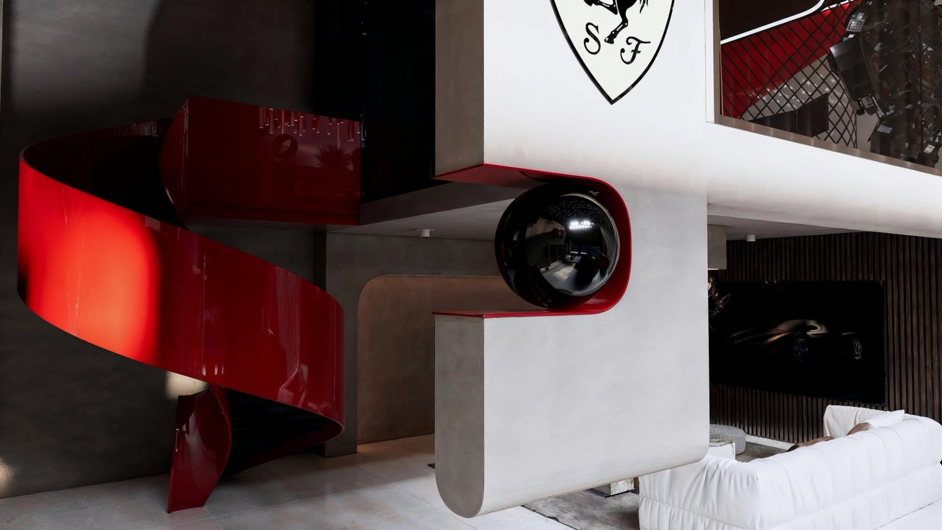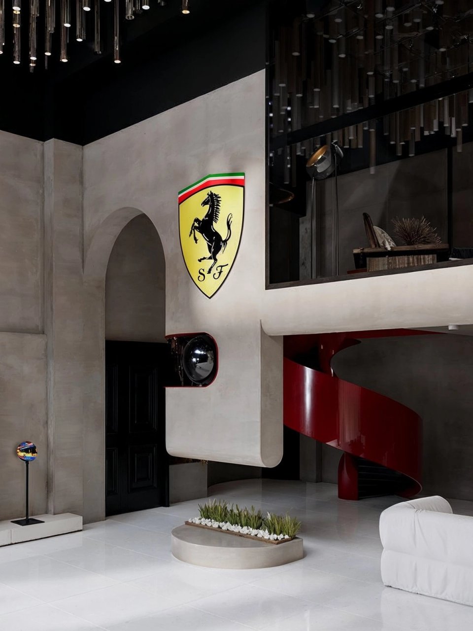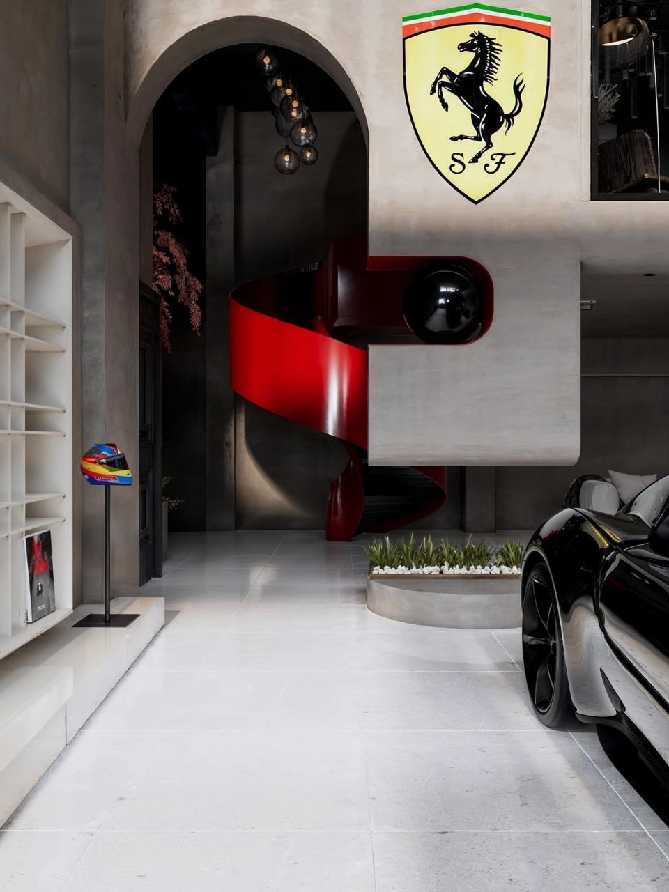 Extension spectaculaire à Dubaï pour un ancien pilote français, SCUDERIA accueille une collection Ferrari dans un espace ouvert sur deux niveaux. L'escalier sur mesure en Rosso Corsa et le baquet de SimRacing moulé sur celui de la Monza SP2 témoignent de l'attention aux détails. Un robot MechWarrior, clin d'œil à la pop culture des années 80, complète l'ambiance. Les matières nobles et les jeux de lumière reflètent la personnalité du propriétaire. Un lieu de célébration en parfaite harmonie avec les rêves du client.
